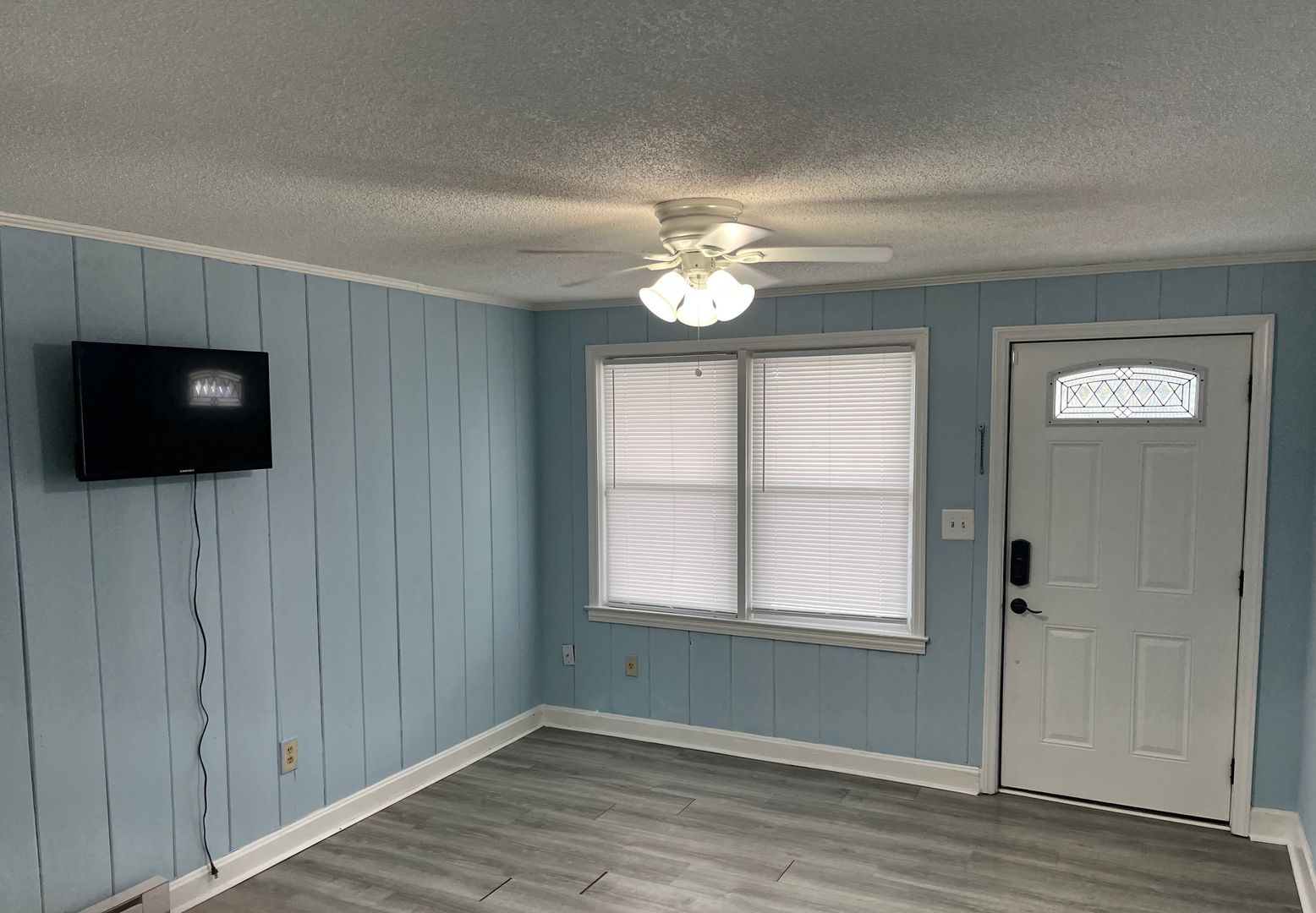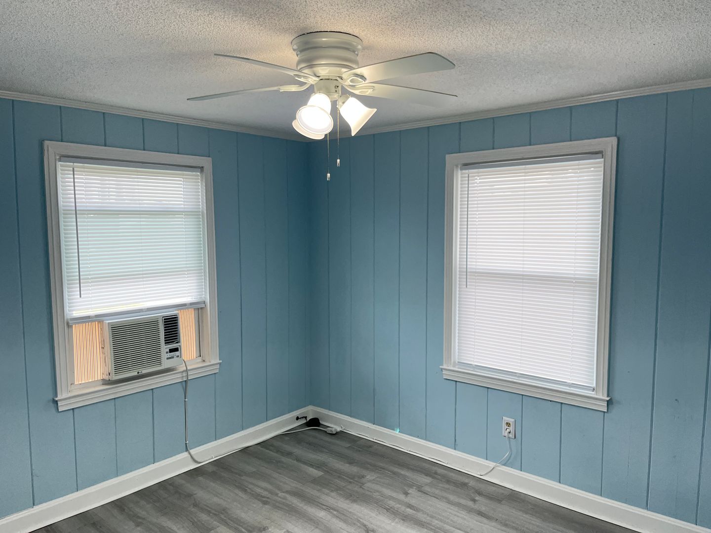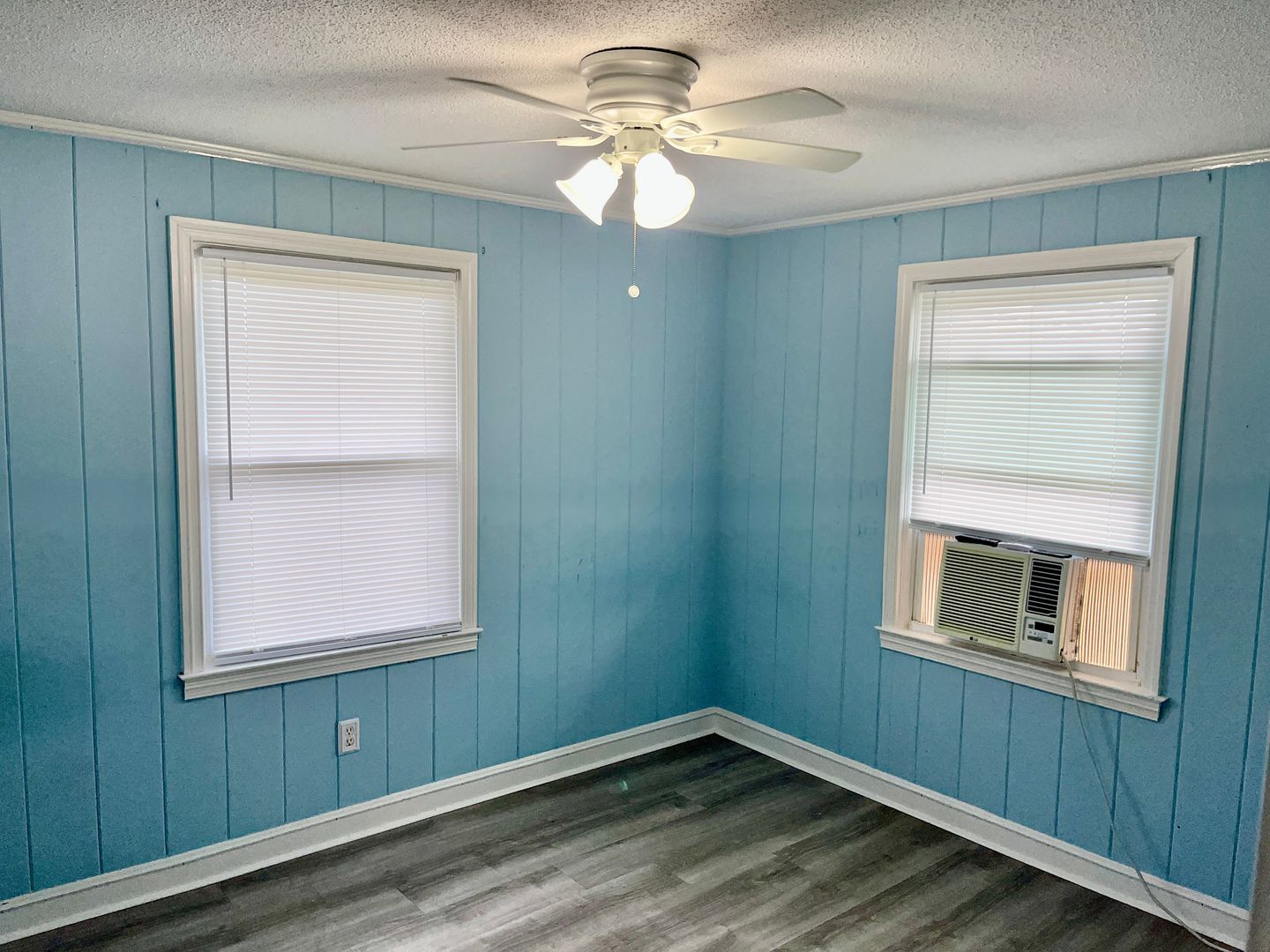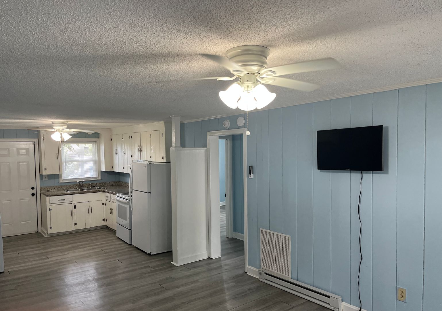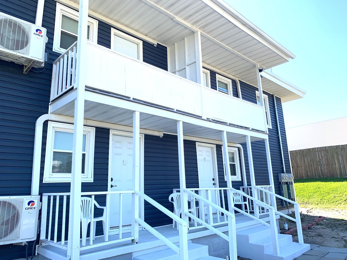 Landlord is offering one-month free with an eighteen-month lease. Walk to the beach! Two-bedroom, one-bathroom condo on the second floor is only two blocks from the beautiful ocean. The unfurnished unit features an open floor plan, including a kitchen, dining area, and living room, with hard surface floors and ceiling fans throughout. The kitchen features charming white cabinets, a window over the sink, a refrigerator, and a stove. A washer and dryer are included in the unit and are provided as-is. Enjoy the shade with an iced tea on the covered front or back porch. The yard has picnic tables and a mounted grill for enjoyment as well. A twelve-month lease is also available.