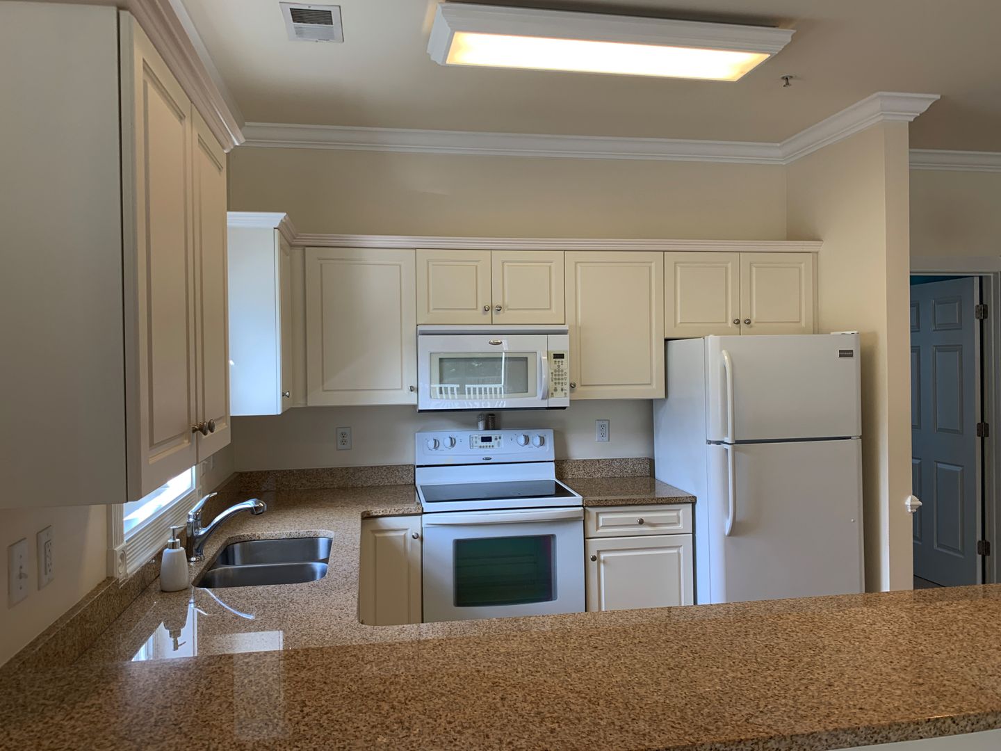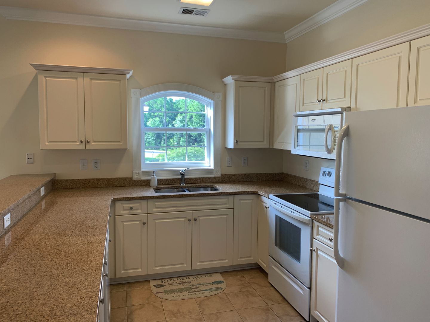 Available now! Enjoy the charms and serenity of living at Tullamore Lakes in Sun Colony. Three-bedroom, two-bathroom, unfurnished condo is a corner unit located on the third floor allowing for vaulted ceilings and a spacious feel. The U-shaped kitchen features tile floors, granite countertops, modern white cabinetry, and window over the sink. It’s equipped with major appliances including a refrigerator, smooth-top stove, over-the-range microwave, and dishwasher. Enjoy meals in the dining area in front of the inset box window or at the breakfast bar. A triple wide glass pane door leads to the screened-in balcony with views of the Colonial Charters Golf Course and wooded area. Large primary bedroom has vaulted ceiling, walk-in closet, and private full bathroom. Additional two bedrooms have vaulted ceilings, fans, and access to the second full bathroom. Washer and dryer are provided in the unit as is with no warranty. Building is not elevator-equipped and use of stairs is required. Please note that the condo residents at Tullamore Lakes do not have access to the pool at Sun Colony. The landlord is offering one-month free with an eighteen-month lease. A twelve-month lease is also available.