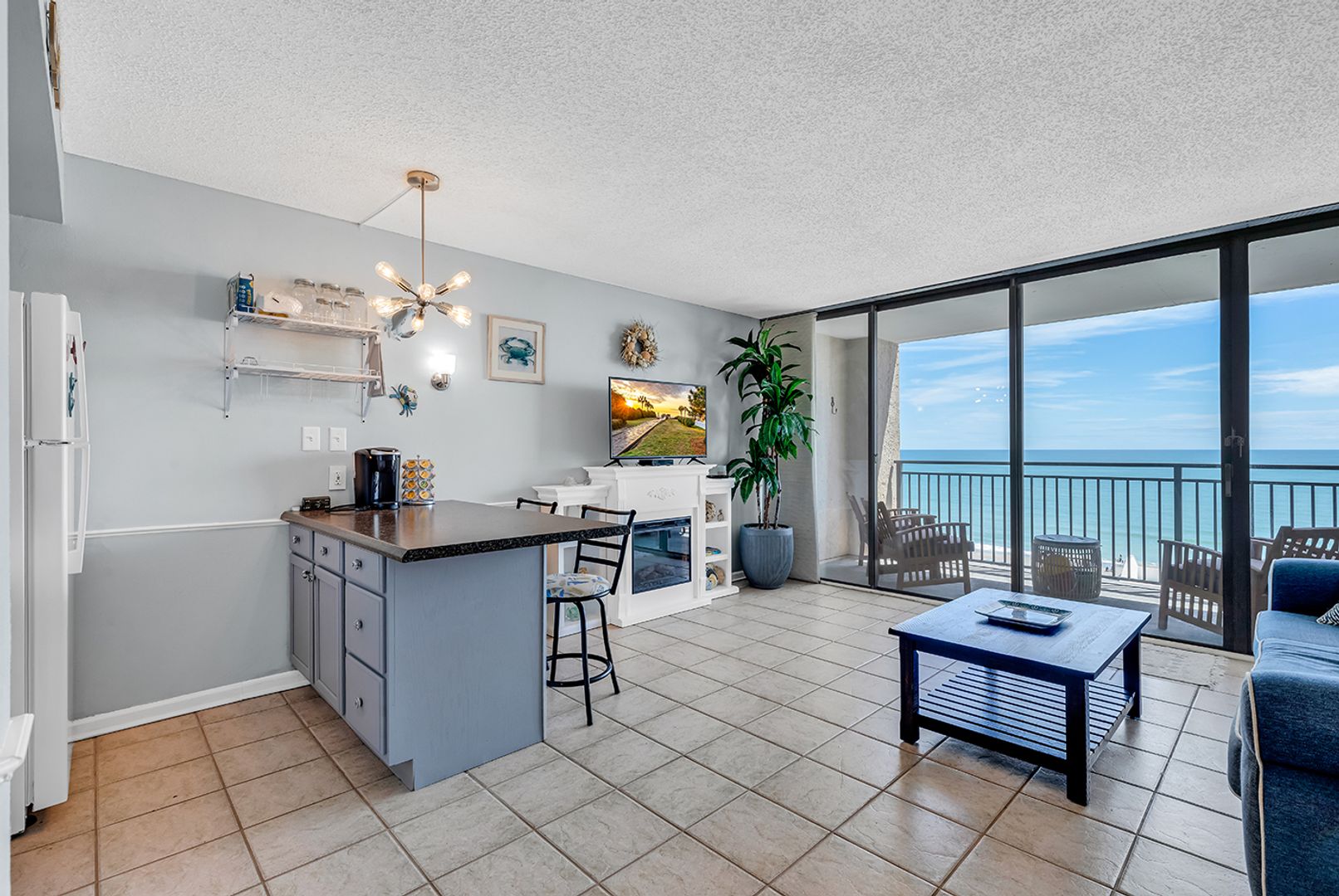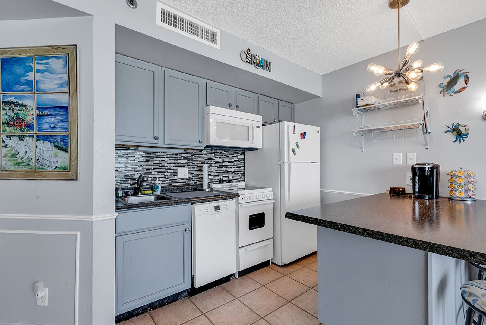 Looking for the perfect beach getaway with views you'll remember for years to come and enough attractions to keep you entertained for an entire stay? Look no further than this gorgeous unit in Ocean Forest Plaza. This one-bedroom unit is set up to be a perfect home away from home for its guests. It boasts an unmatched view of the ocean and a stylish décor that was hand-selected with care! Unlike other one-bedroom units, this condo still contains all of your necessary appliances! The kitchen has a full-size refrigerator, a miniature dishwasher, and a miniature oven, as well as a an over-the-stove microwave.