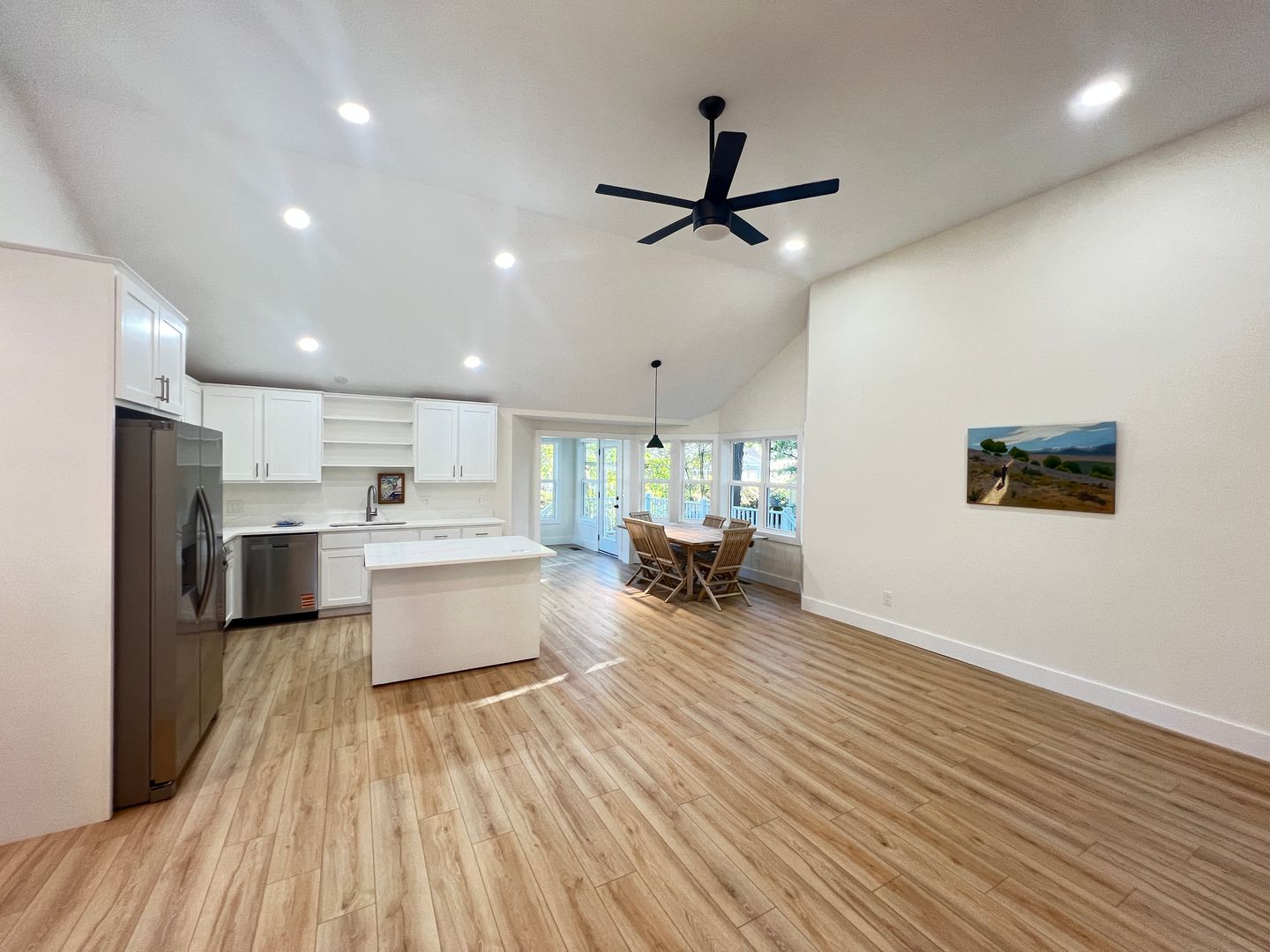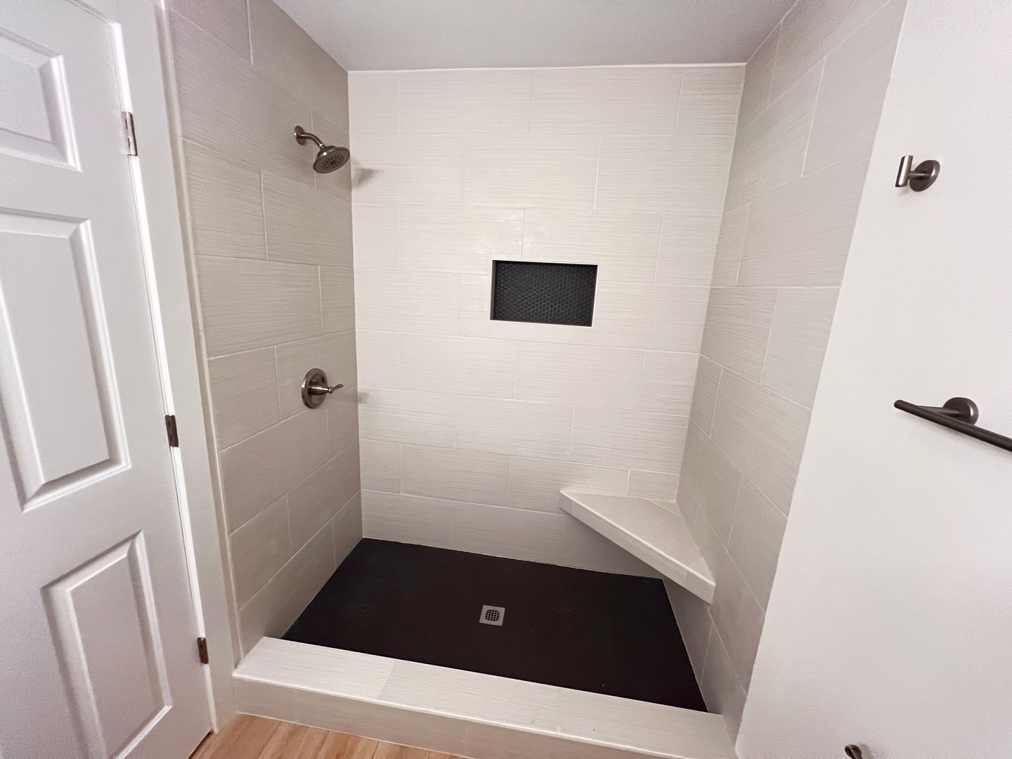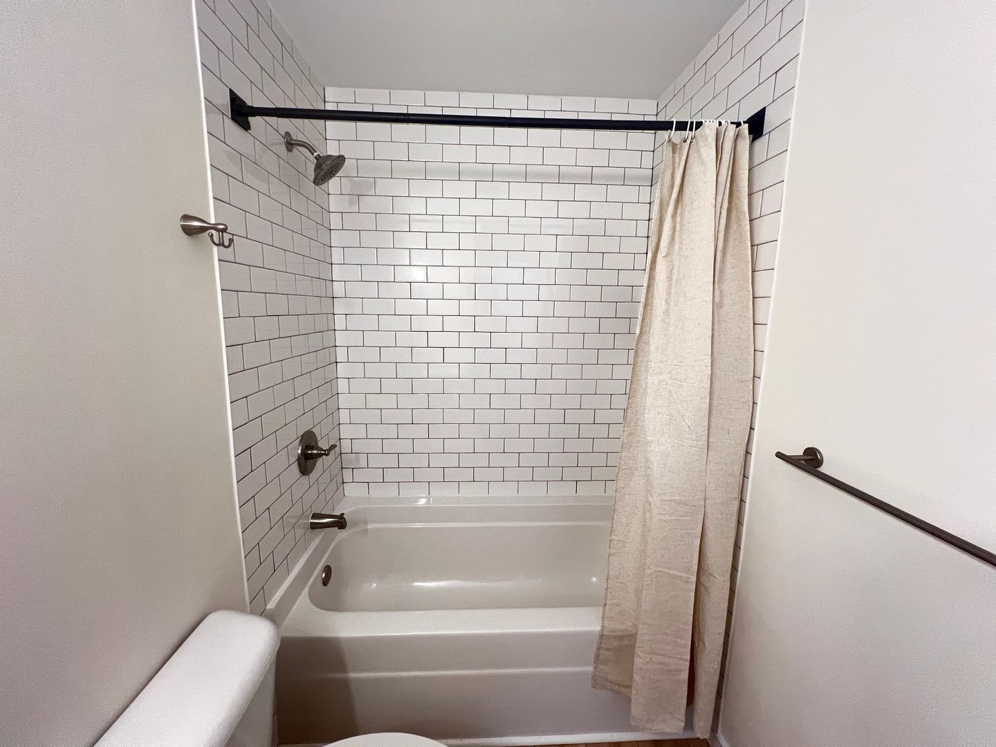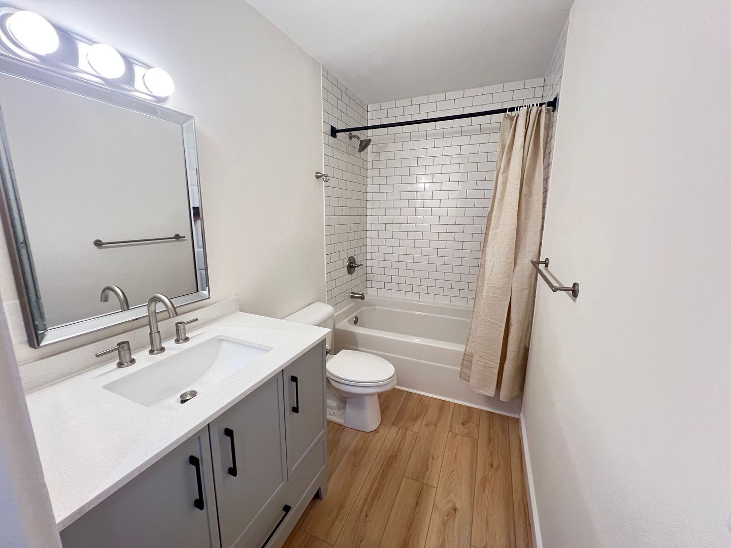 The primary bedroom features a ceiling fan and its own private bathroom with a tiled shower. Two other bedrooms also have lighted ceiling fans and share a hall bathroom with a subway-tiled tub/shower combination.