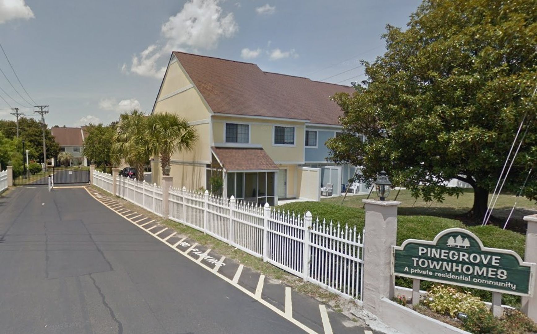 Pinegrove Townhomes is a quaint gated community 1.5 miles from the ocean and features an outdoor pool. Unit F is an unfurnished, pet friendly, two bedroom, one and a half bathroom town home. The living room is bright and welcoming with a wall of glass windows and doors leading to the back patio. The kitchen is complete with white appliances including a smooth top stove, refrigerator, and dishwasher. There is a half bathroom on the first floor. Both bedrooms and the full bathroom are located on the second floor. Available NOW!