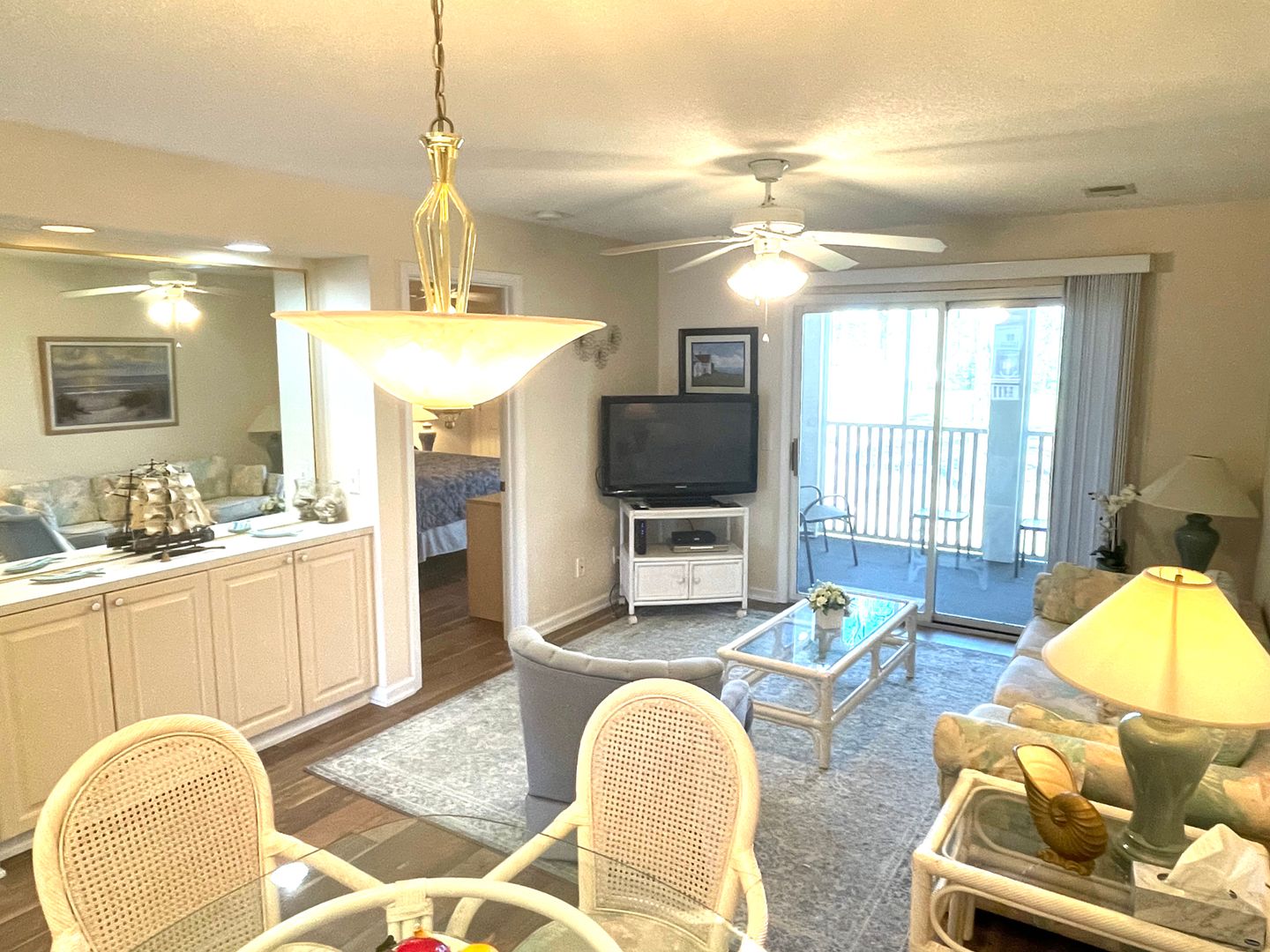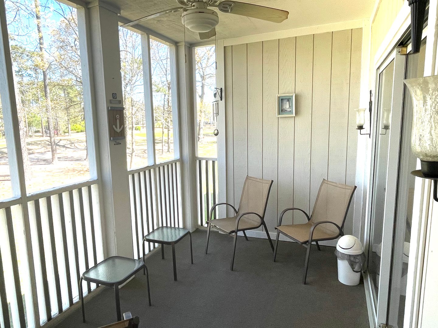This two-bedroom condo has an open floor plan with a fully equipped kitchen, dining area, and living room which features a flat-screen TV, and access to a quiet, golf course view from the screened porch. This porch is the perfect spot to enjoy a relaxing morning cup of coffee or sip an afternoon tea.